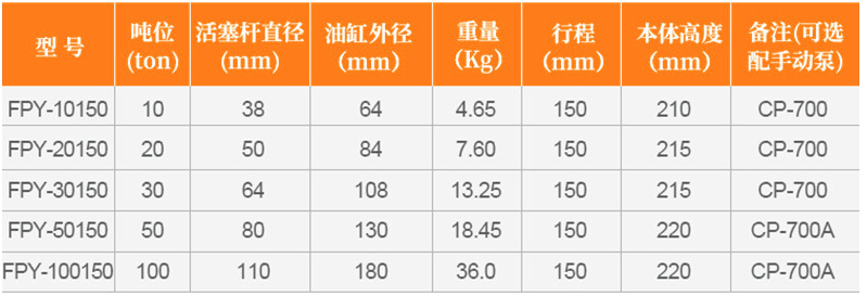 1.為了正確操作,所有FPY系列油缸需與堅固的項升表面相連。如在沙質的,泥土或松動表面中使用薄型油缸會導致油缸損壞